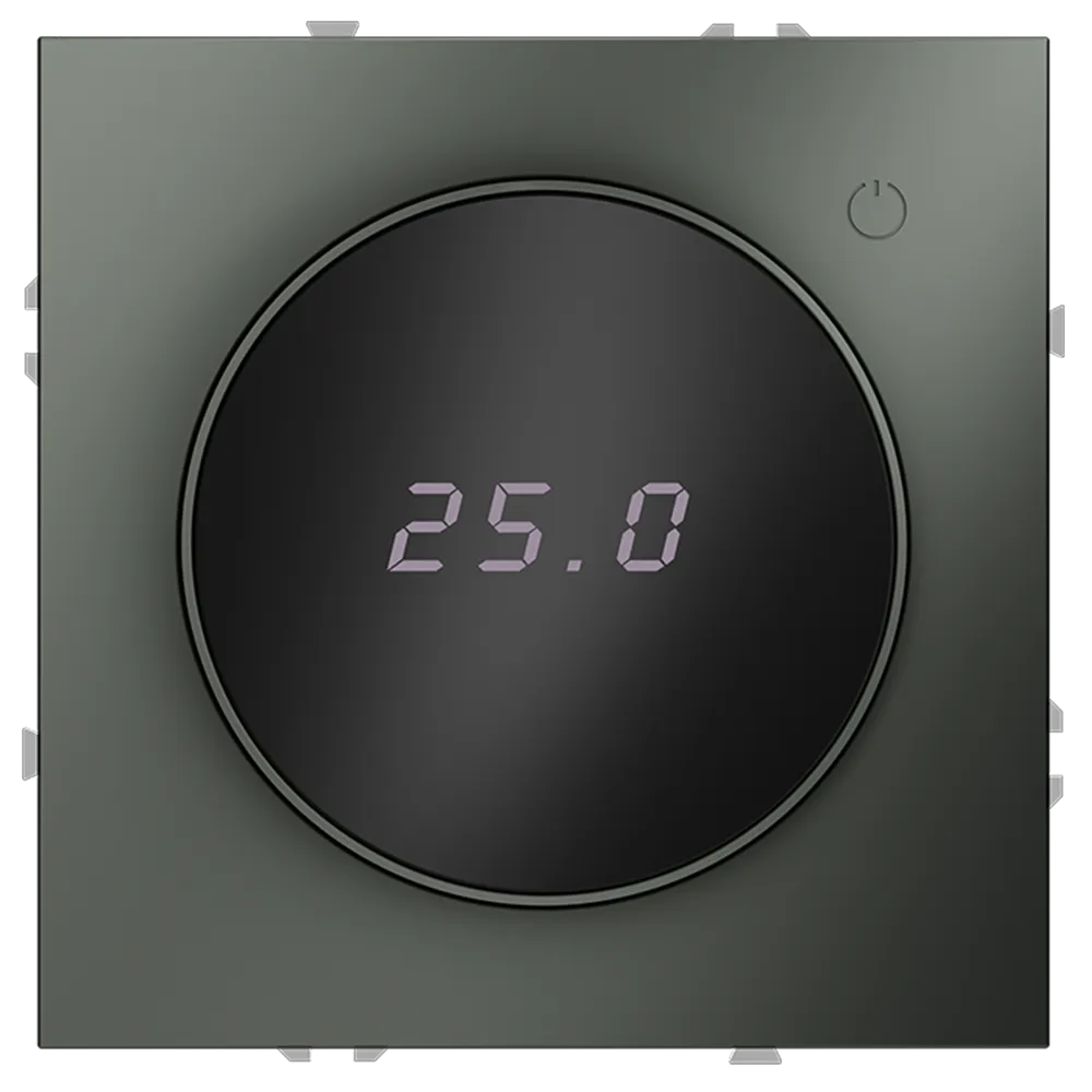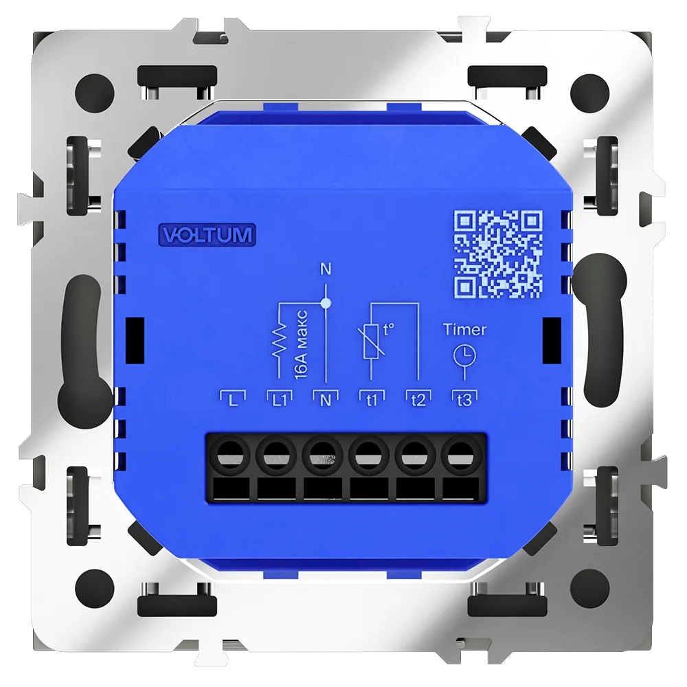 Место установки. Терморегуляторы Voltum предназначены для регулирования температуры электрического теплого пола. Актуальны как в городских квартирах, так и в загородных дачных домах без центрального отопления. Корпус. Дизайн терморегуляторов Voltum сочетается со стилем остальных электрических устройств компании. Они совместимы со всеми рамками. Материал внешних декоративных элементов — поликарбонат. Конструктивные особенности. Терморегуляторы работают с любыми типами теплых полов и рассчитаны на нагрузку до 3500 Вт. Устройства оснащены светодиодной индикацией режима и дисплеем, на котором отображается температура поверхности пола. Красный индикатор — «подача питания на нагревательный кабель (идет процесс нагрева)», отсутствие индикации — «заданная температура достигнута». В течение 15 минут после нагрева терморегулятор переходит в интеллектуальный «спящий режим», уменьшая яркость подсветки цифр и сокращая энергопотребление. Регулировка осуществляется вращением панели управления. Терморегулятор поставляется в комплекте с механизмом из пластиковой накладки и датчиком температуры.